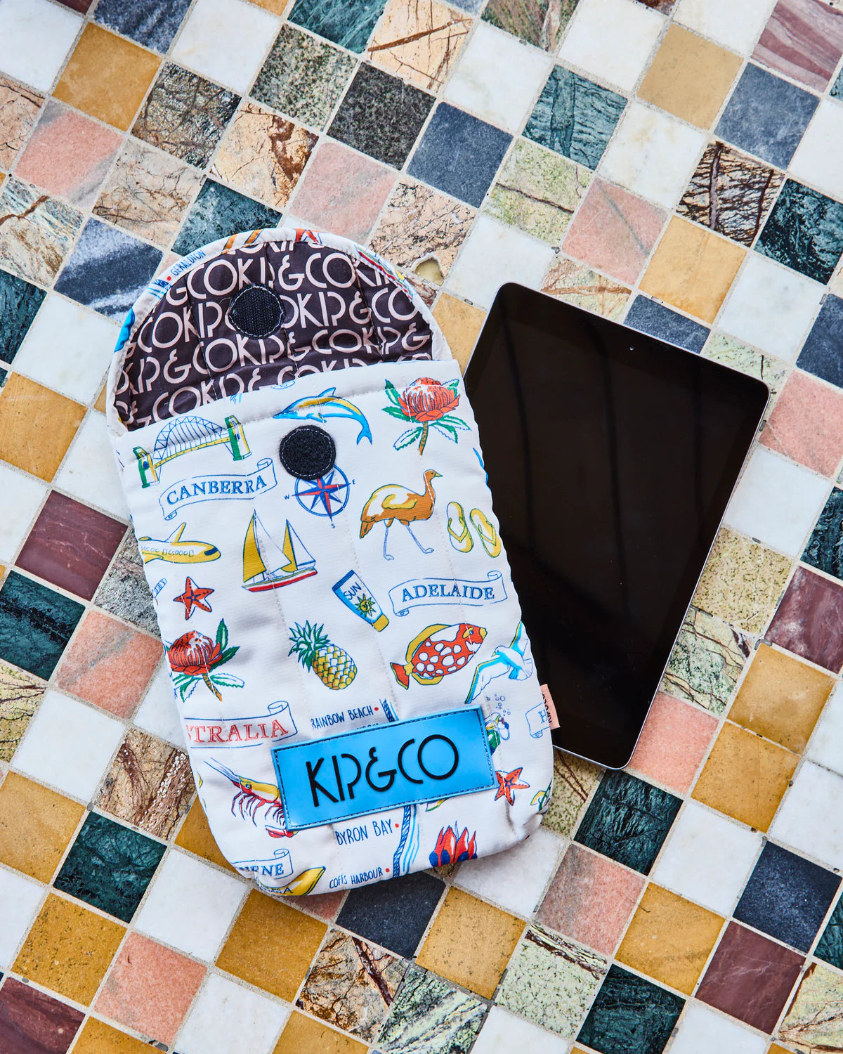 Our printed Aussie Road Trip iPad Pouch is made from quilted recycled ripstop nylon, with padded protection to keep your device safe from knocks and bumps. Lightweight, durable, and dressed in Kip&Co colour, it’s perfect for kids, teens, and grown-ups alike. Tech never looked this fun! Our Aussie Road Trip print features famous sights and Aussie delights on a white base.