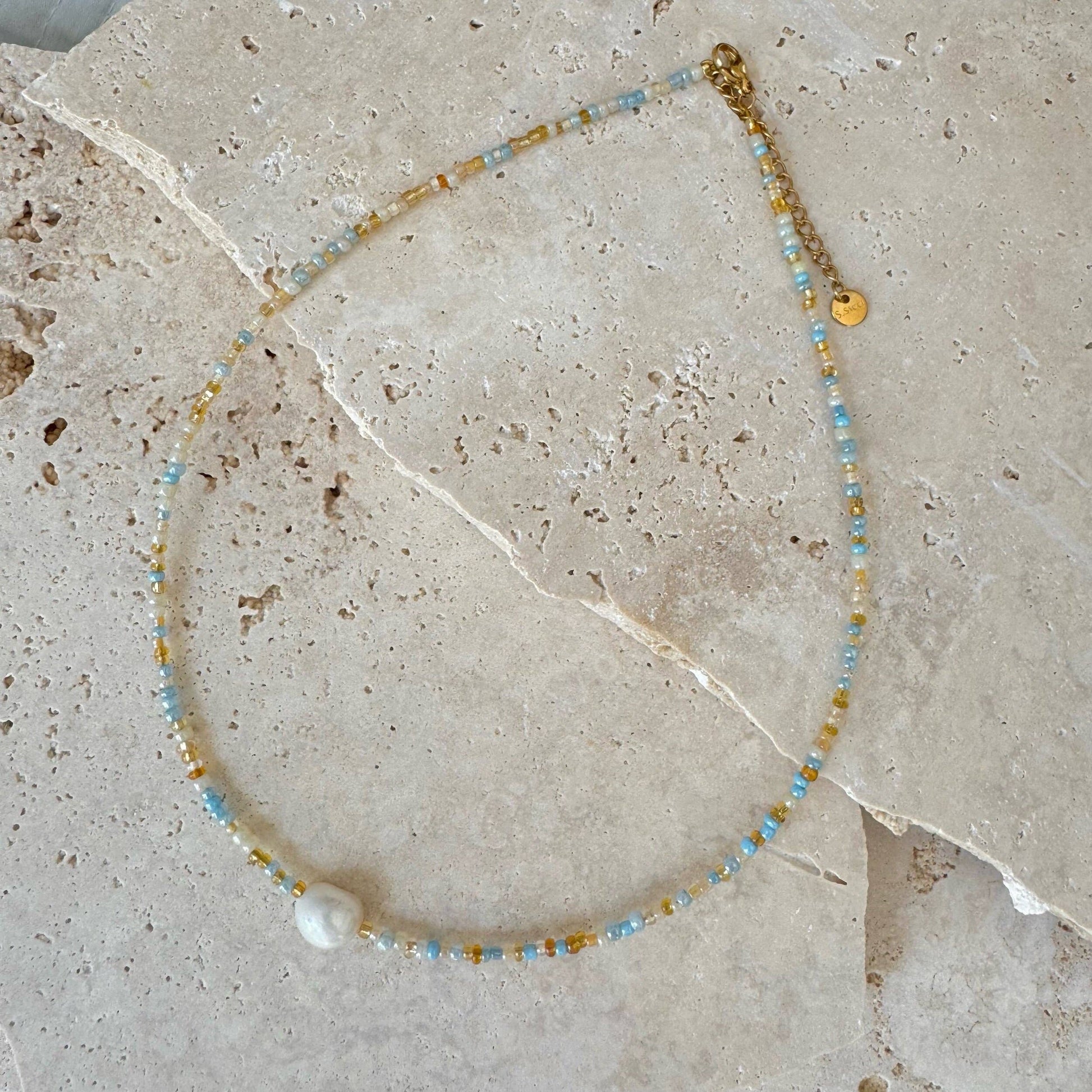 A single strand of pearly colour 2mm glass seed beads with a single authentic baroque pearl and 24k gold plated Miyuki Japanese beads.