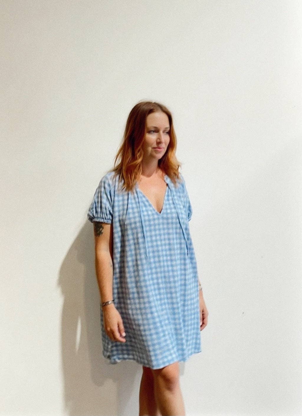 The Forget Me Not Dress is an easygoing piece made for everyday wear. Its relaxed fit and dusky blue gingham fabric keep things comfortable and simple. Short puff sleeves add just enough style, and the handy pockets are perfect for stashing your essentials. The extra length at the back is ideal for running after your little humans at the park, giving you a bit more coverage without any fuss.