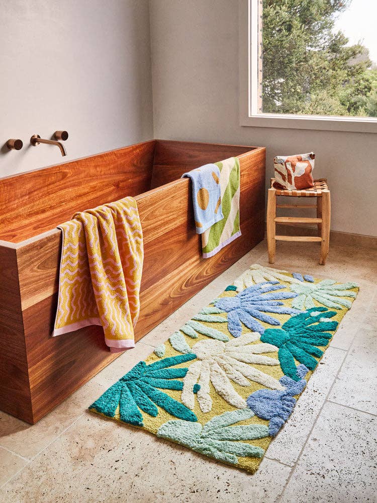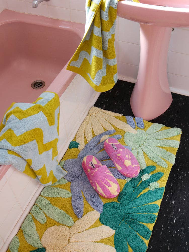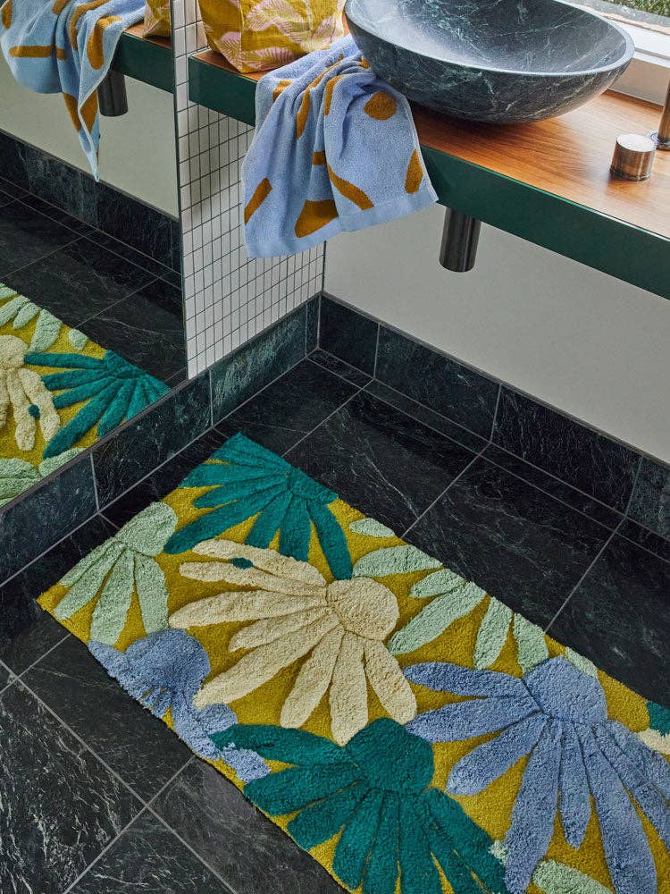 Add some playfulness to your bathroom with the Margarita Bath Runner. With its oversized floral motif in cornflower, mint, chartreuse and cream, this runner is designed to pair effortlessly with our Pistachio Stripe or Daiquiri towels. The longer style is perfect to sit underneath a double vanity or bathtub.