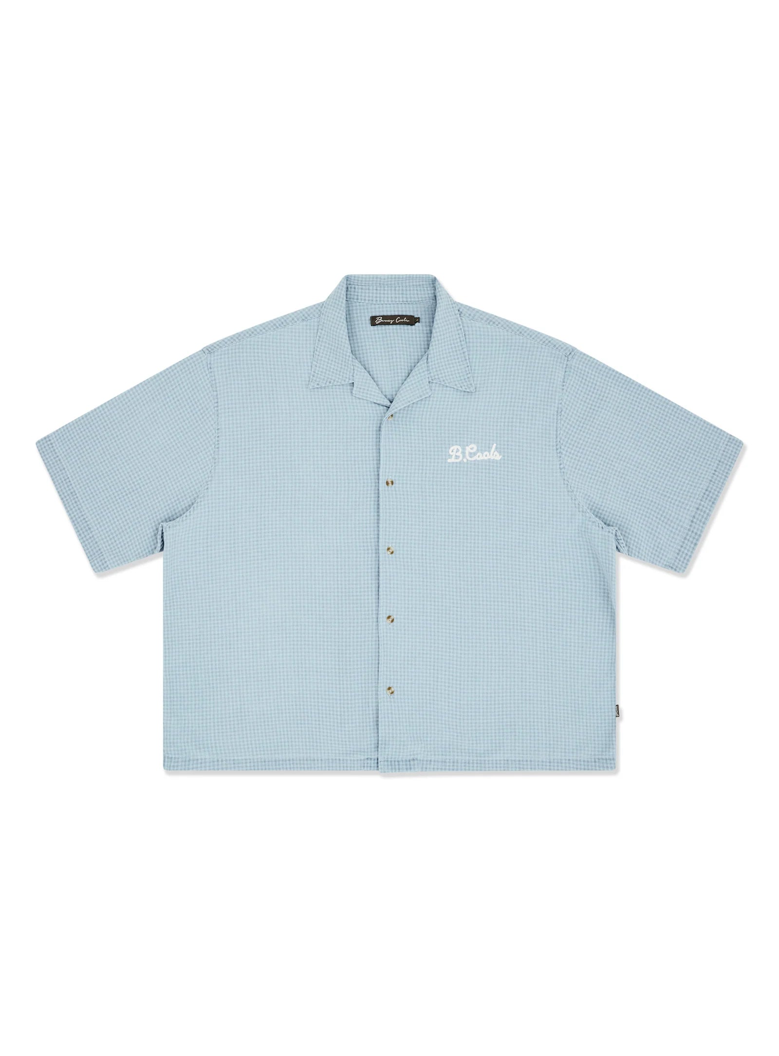 The Script Shirt in Blue. Lightweight cotton indigo fabric with subtle houndstooth fabric weave. Resort collar, boxy body and shorter length with chest embroidery. Light bleach wash.