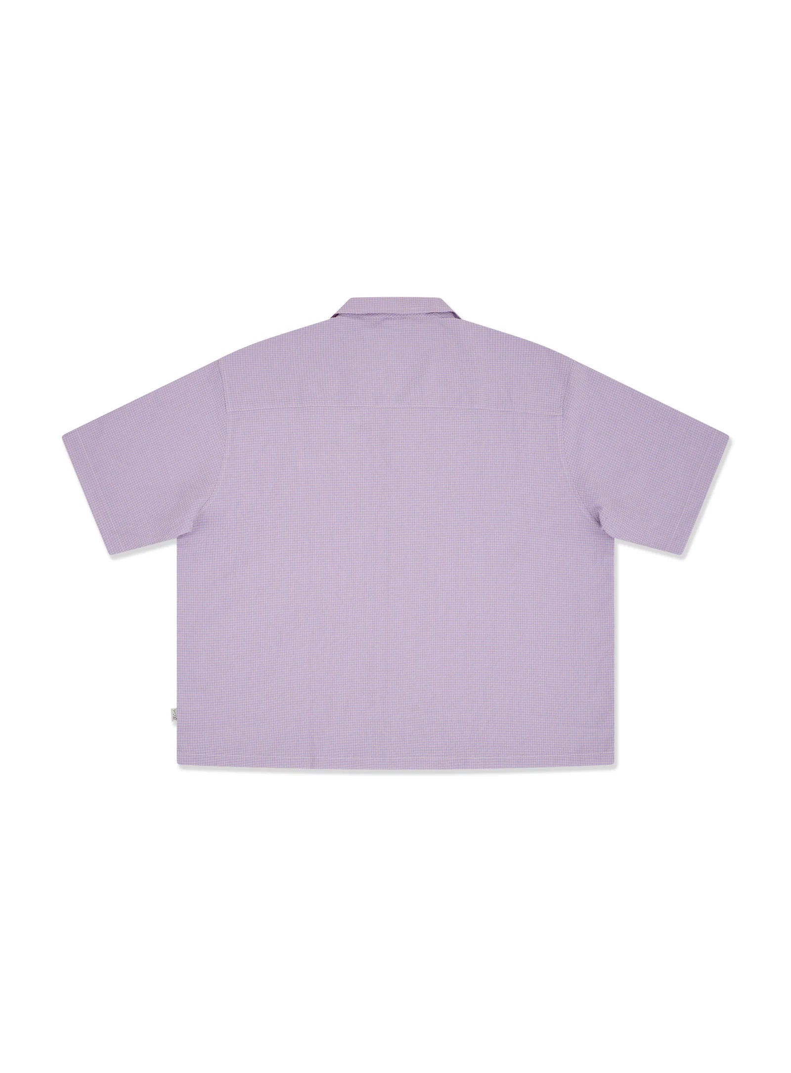 The Script Shirt. Lightweight gingham fabric with chest logo embroidery. Boxy fit, resort collar and shorter length.